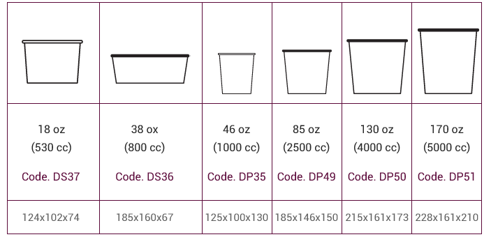 | Product | 18 oz DS37 | 38 oz DS36 | 46 OZ BUCKET P35 | 85 OZ BUCKET DP49 | 130 OZ BUCKET DP50 | 170 OZ BUCKET DP51 |